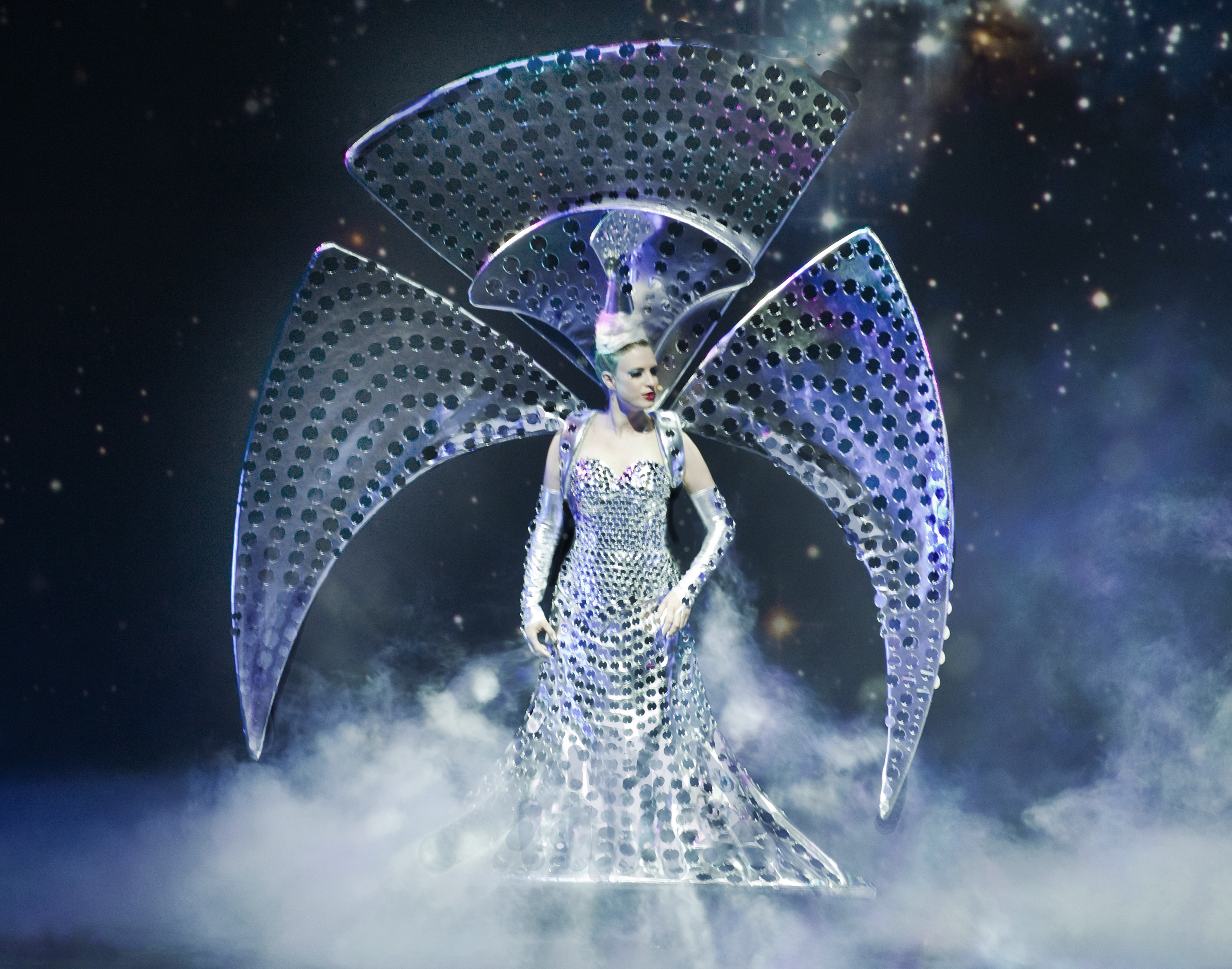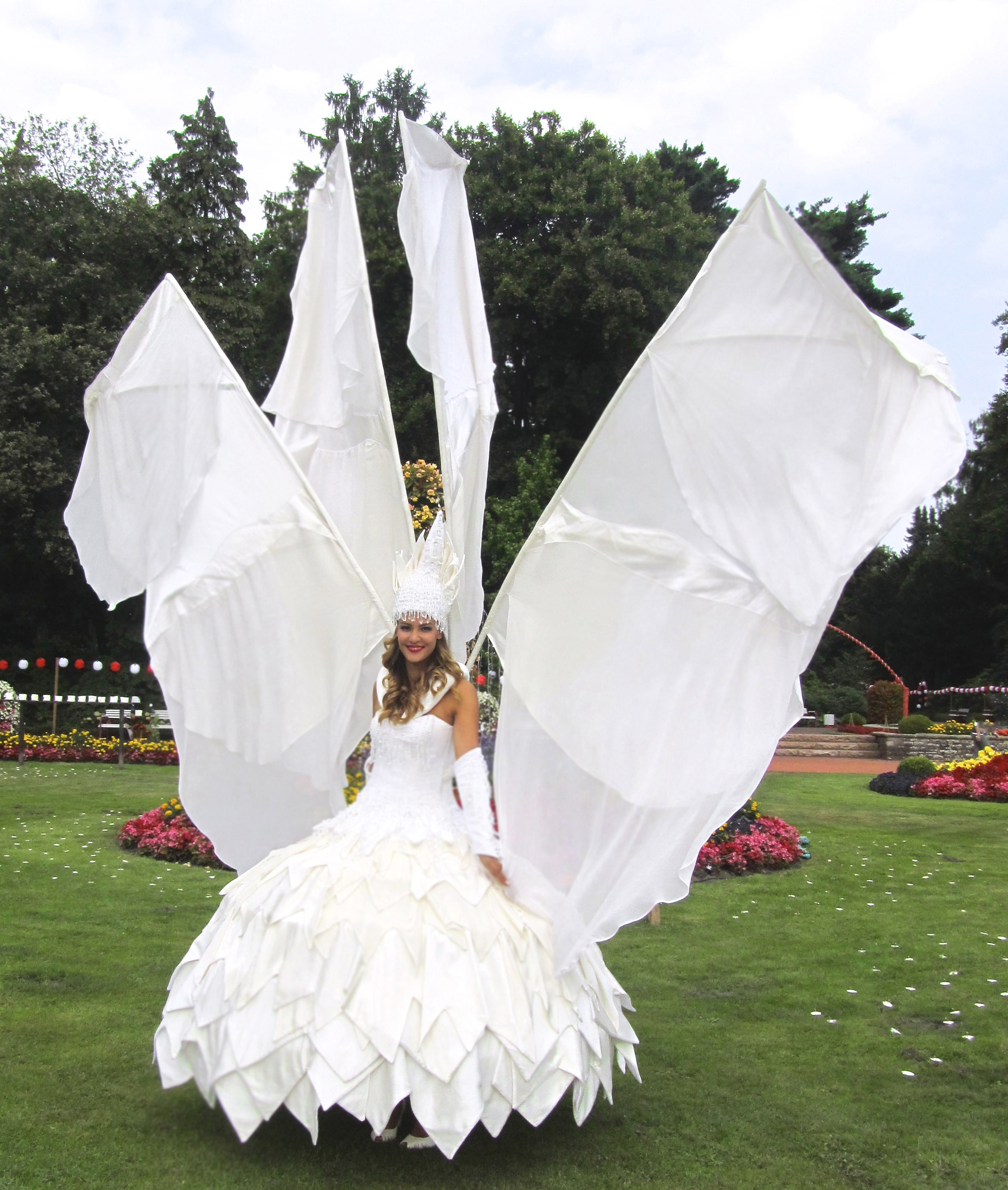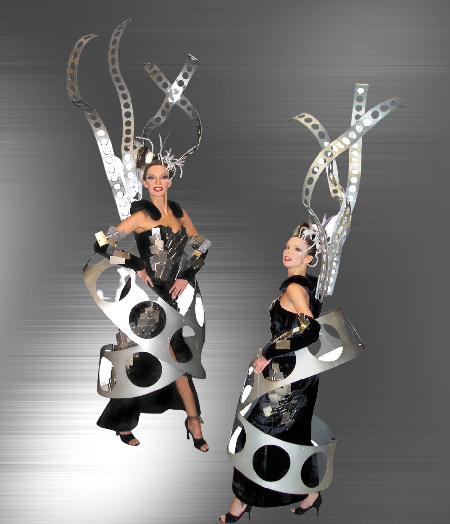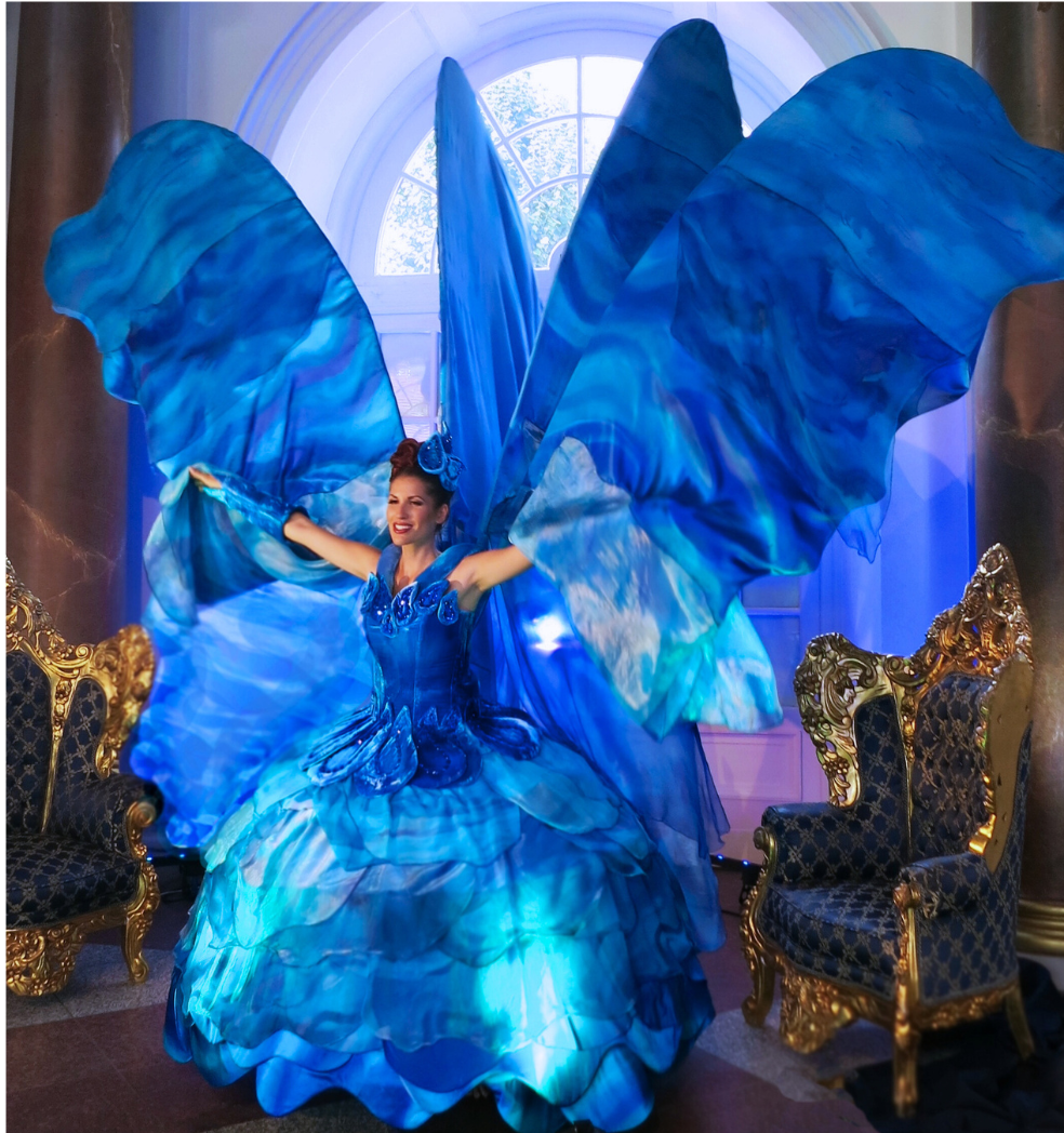 Unsere Kostüme aus farbenfroher Seidenmalerei und stilvoll gezogenen Aluminium-Kunstformen eignen sich perfekt für Messen, Kundenevents, Galas, Hochzeiten - überall dort, wo Sie etwas Aufregendes als Blickfang oder beliebtes Fotomotiv brauchen.