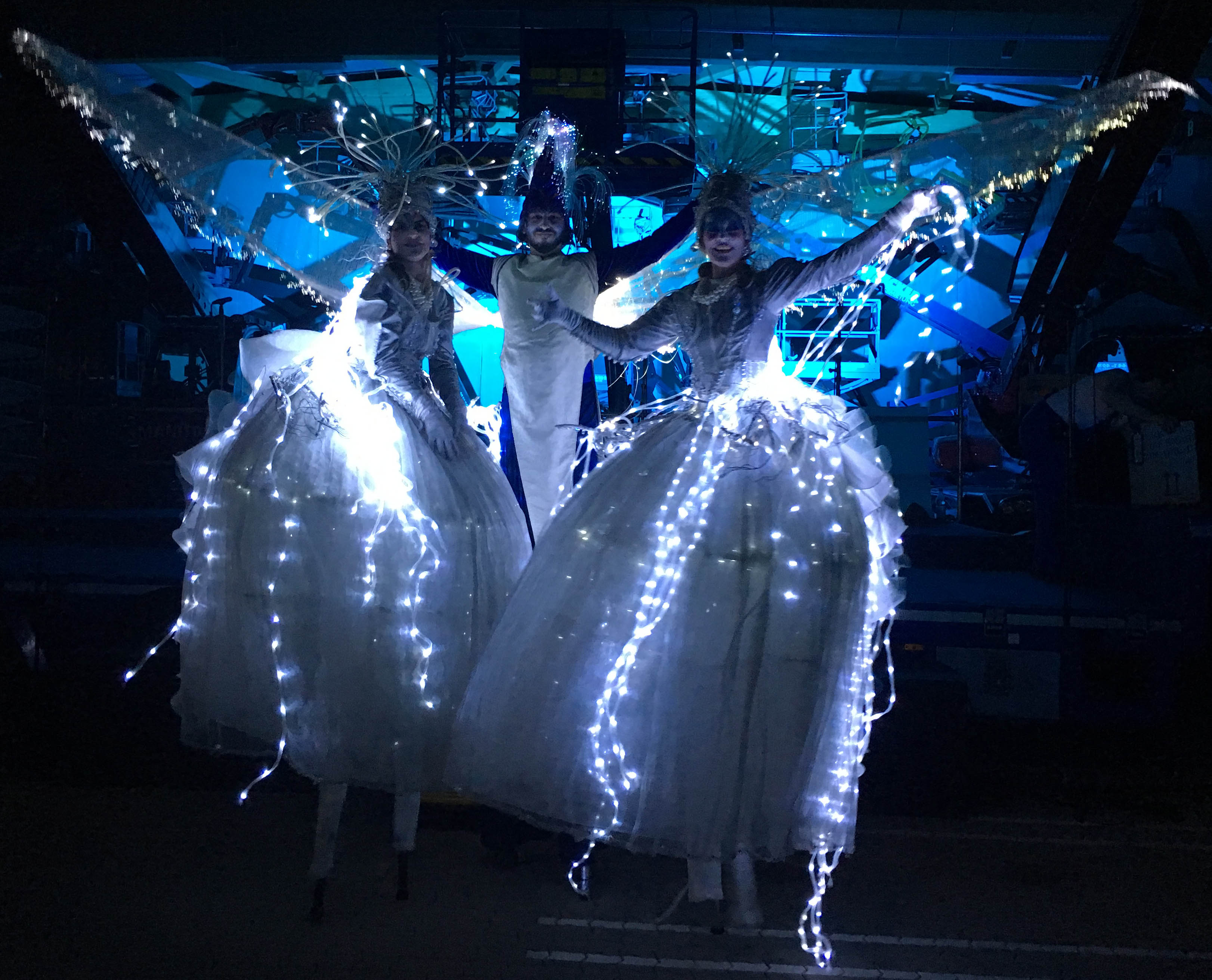 Mit Einbruch der Dunkelheit verändert sich auch die Wirkung der Inszenierung. Beleuchtete Kostüme setzen gezielte Akzente, schaffen Orientierung und verleihen Veranstaltungen eine besondere Tiefe. Sanfte Lichtquellen, integrierte LED-Elemente oder dezente Farbwechsel lassen Stelzenläufer abends noch stärker wirken – elegant, modern und atmosphärisch. Besonders bei Abendveranstaltungen, Galas oder Outdoor-Events entstehen so eindrucksvolle visuelle Momente.